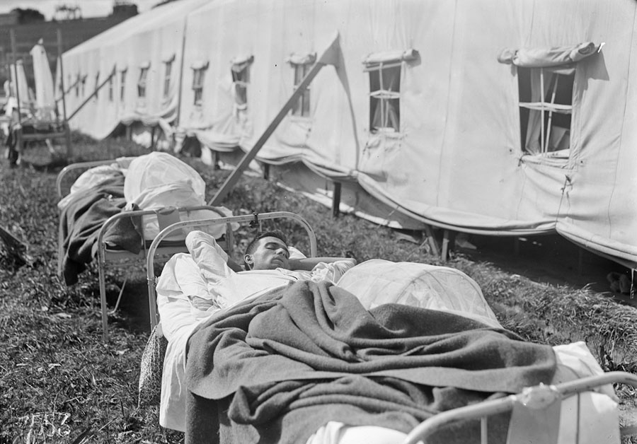 Read moreOriginal caption: "Sun treatment for bad wounds, Hospital #5. Wounded American soldiers taking the sun cure at American Military Hospital No. 5 at Auteuil, which is supported by the American Red Cross. In this treatment, the wound is exposed and unbandaged to the full sunshine with only the protection of a mosquito netting stretched above it to protect from insects, etc. September, 1918." #