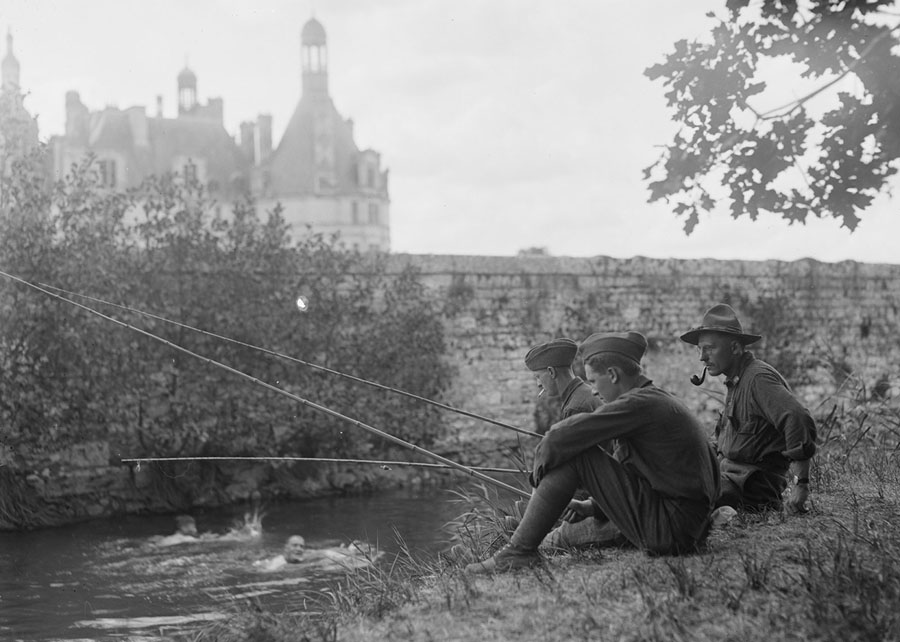 Read moreOriginal caption: "Shell-shock patients having a happy time fishing under the wall of the old chateau. Under the walls of the old chateau these Americans are recovering from war-neurosis, as the scientists now call the condition that used to be described as 'shell-shock.' Capt. A.E. Dennis, Red Cross hospital representative for the U.S. Army at Blois, has obtained wonderful results by taking a number of these patients away from the noise and congestion of the hospital to a quiet outdoor life in the forest of the Chateau Chambord near Blois. September, 1918." #