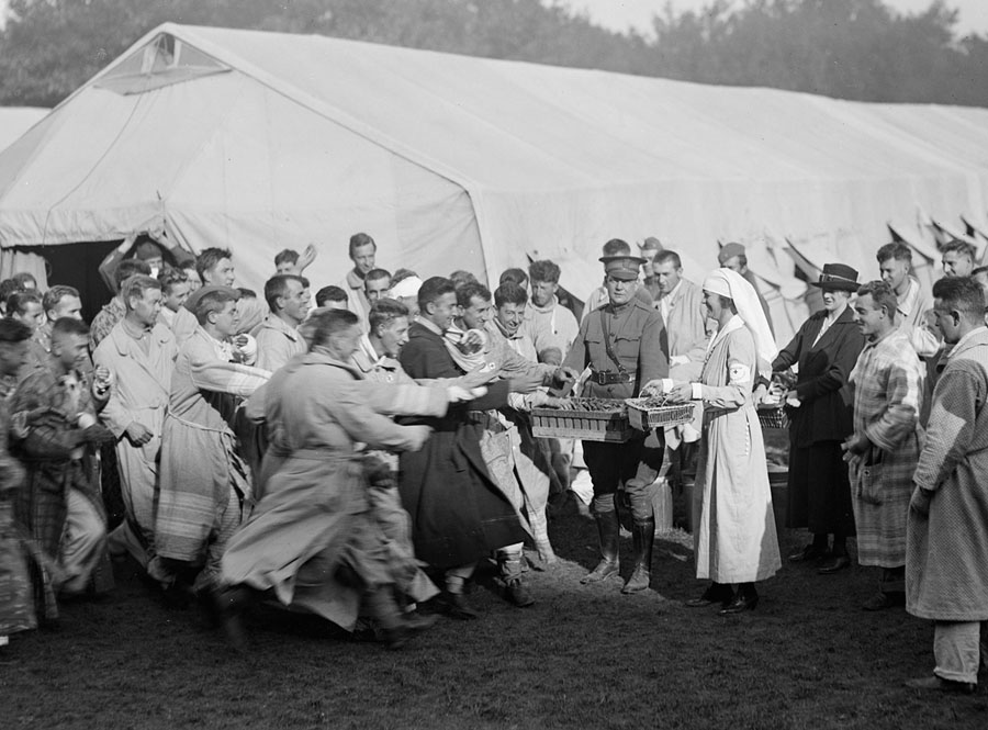 Read moreOriginal caption: "The usual afternoon rush when Red Cross Lady and Capt. Sterling S. Beardsley arrive to distribute chocolate. Base Hospital St-Denis. September, 1918." #
