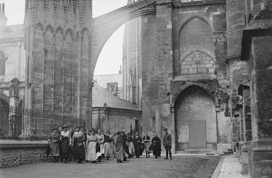 Read moreOriginal caption: "This is where the socks are mended. Bureau of refugees, Tours. In an old monastery building adjacent to the Great Cathedral at Tours, a group of refugee women under the auspices of the Red Cross are coming to their work of mending socks for the American soldiers. This is part of the great salvage work—that is, making socks, sweaters, etc. that have been worn as good as new, while at the same time the women are enabled to support themselves. In this one group, a quarter of a million socks and 150,000 other garments have been mended in two months and nearly 70,000 francs have been earned by the women. Their earnings average five to six francs a day. September, 1918." #