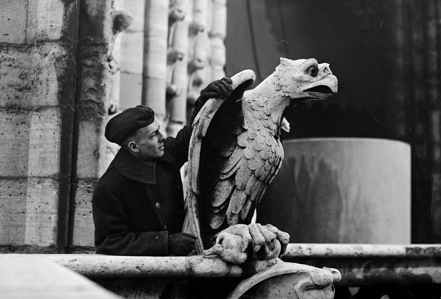 Read moreOriginal caption: "Paris. The American Red Cross man took this 'doughboy' to see the wonders of Notre Dame. He climbed high up in one of the towers where he is shown addressing this fine stone bird, 'You ain't the American eagle.' March, 1919." #