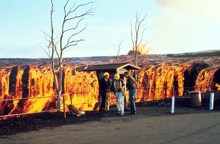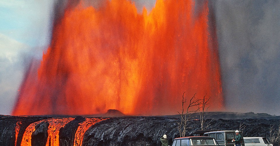 Read moreA 1,000-foot lava fountain in the Mauna Ulu vent area, on December 30, 1969. Lava flows, fed by the fountain, cascaded into Alo'i Crater, at left. 2,000 feet from the vent. A couple of hours after the photo was taken, the wind shifted, and the black Ford station wagon, still parked in the same place, was pelted with falling pumice and needed, though never received, a new paint job. #
