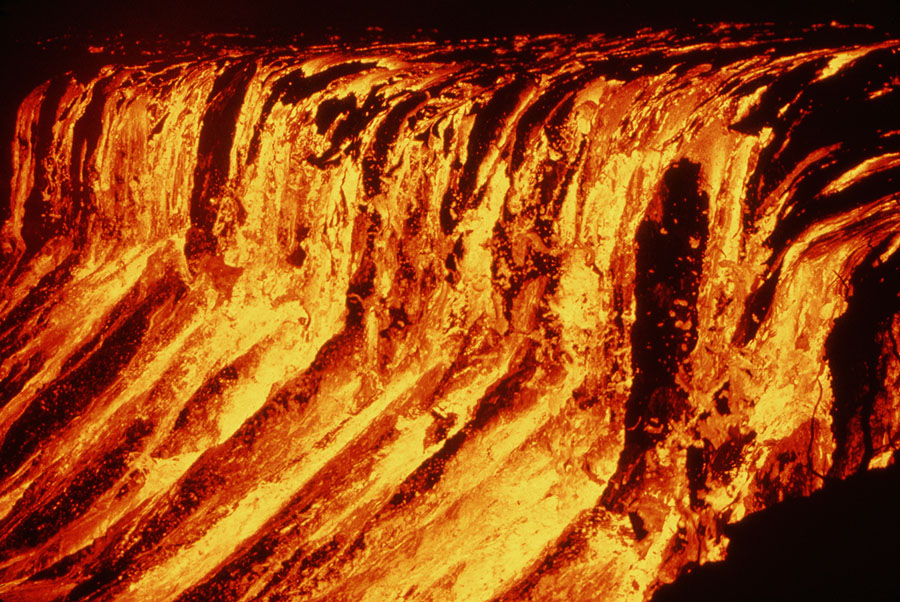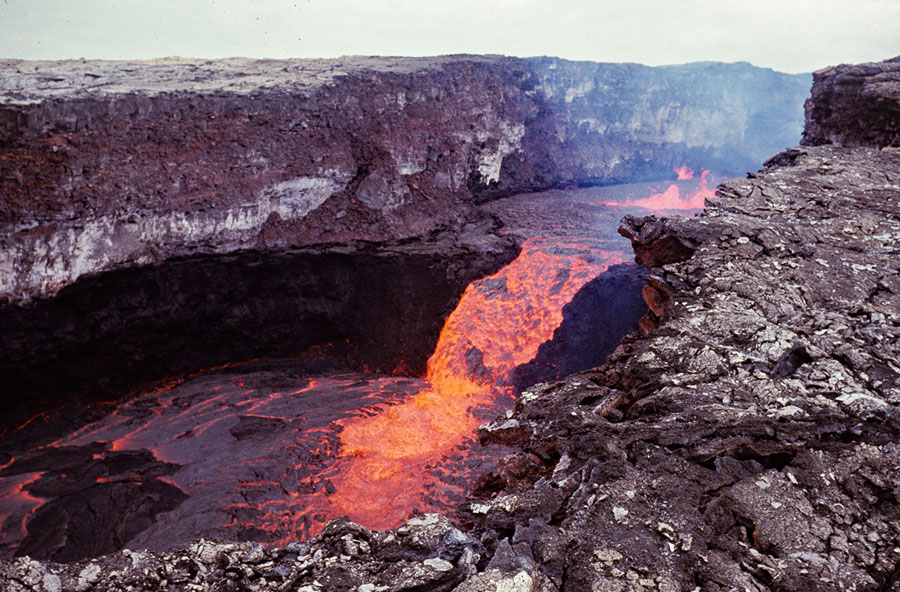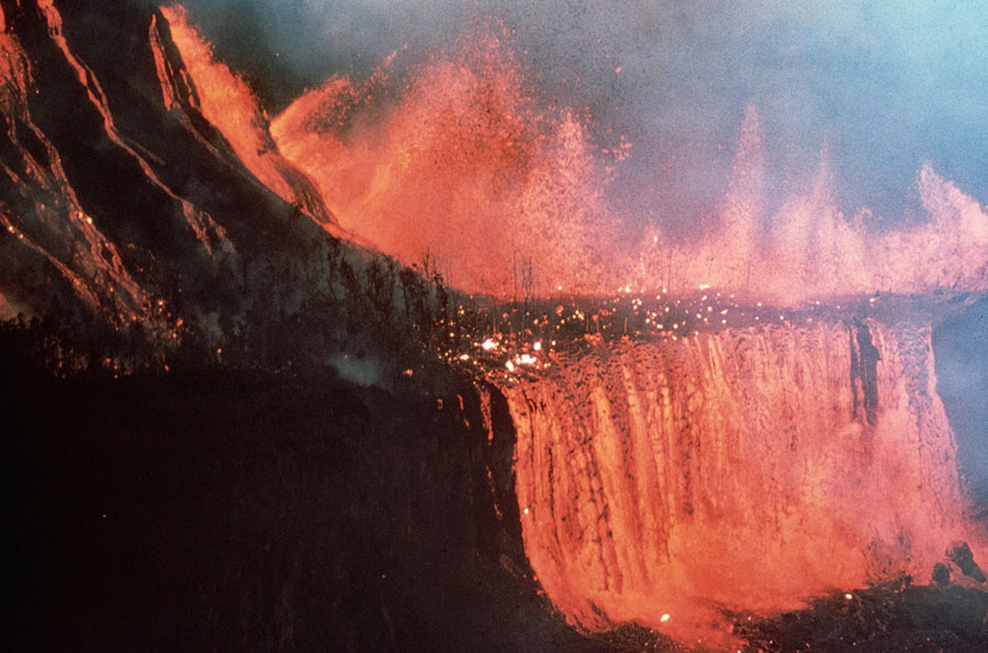 Read moreDuring the 1969 to 1974 Mauna Ulu eruption, a lava fall cascades into Alae Crater. Lava falls higher than Niagara Falls began to fill Alae Crater on August 5, 1969, following a catastrophic draining on August 4. Renewed fountaining at Mauna Ulu sent lava into Alae, starting to refill the crater. The total height of the lava falls was more than 330 feet, and the width more than 1,000 feet. #