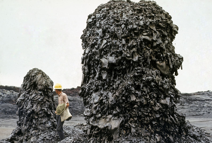 Read moreJeff Judd stands beside beehive spatter chimneys in Aloi Crater. These spires developed over time from a buildup of lava spatters on the surface of the lava fill in the crater. #