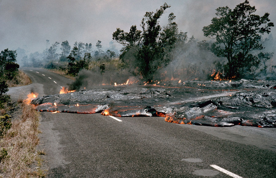 Read moreA flow of lava covers a section of the Chain of Craters Road. Vegetation at the edges of the flow catches on fire, near Hi'iaka Crater in Hawaii Volcanoes National Park on May 5, 1973. #