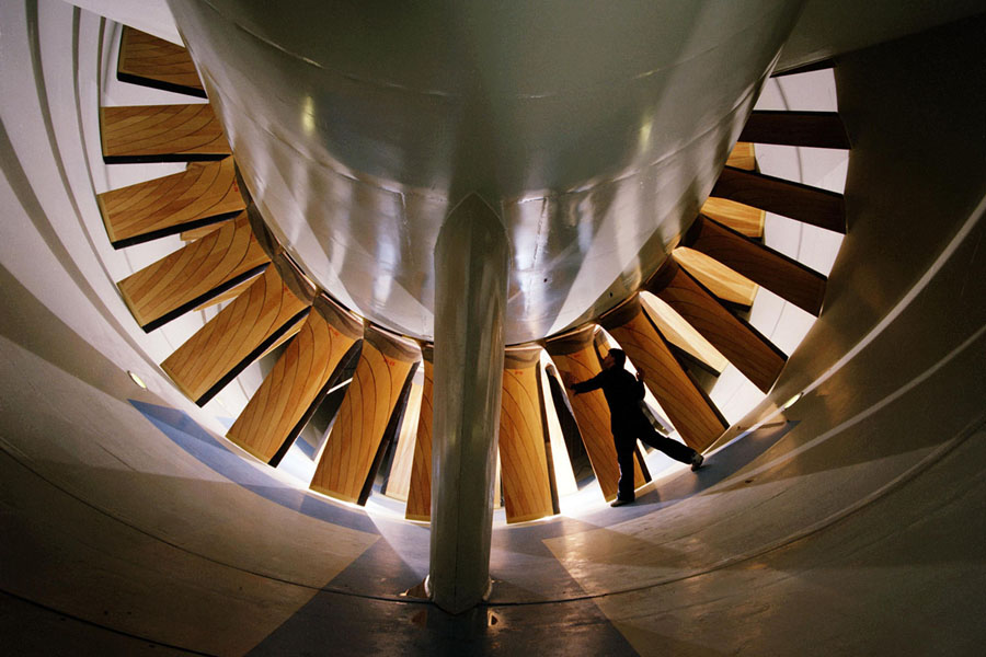 Read moreA technician prepares to unlatch the door built into the guide vanes of the 16-foot transonic wind tunnel at NASA Langley Research Center in Hampton, Virginia, in March of 2010. The tunnel, one of dozens of research facilities at Langley, was built in 1939 and operated until 2004, when it was retired as part of a national initiative to optimize government-owned wind tunnels. Operating "transonically" or across the speed of sound, the air in the test section traveled from about 150 to 1,000 miles per hour. The guide vanes, which formed an ellipse 58 feet high and 82 feet wide, cut across each cylindrical tube at a 45-degree angle. Similar sets of vanes at the three other corners of the wind tunnel turned the air uniformly as it rushed through the 1,000-foot race track-like enclosed tube. If guide vanes were omitted, the air would have piled up in dense masses along the outside curves, like water rounding a bend in a fast brook. #