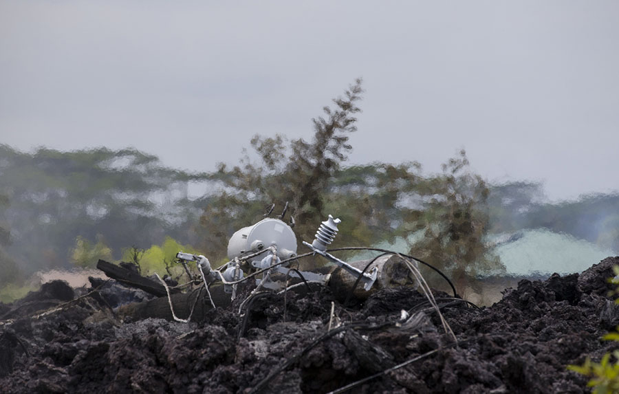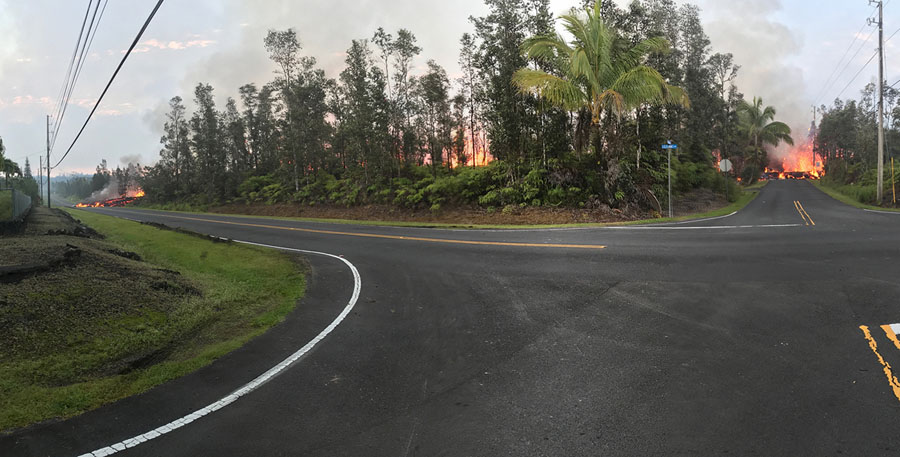 Read moreA panoramic view of a lava fissure cutting through Leilani Estates on May 5, 2018, at the corner of Leilani Street and Pohoiki Road. Earlier, a crack opened on Pohoiki Road (right) just east of Leilani Street. #