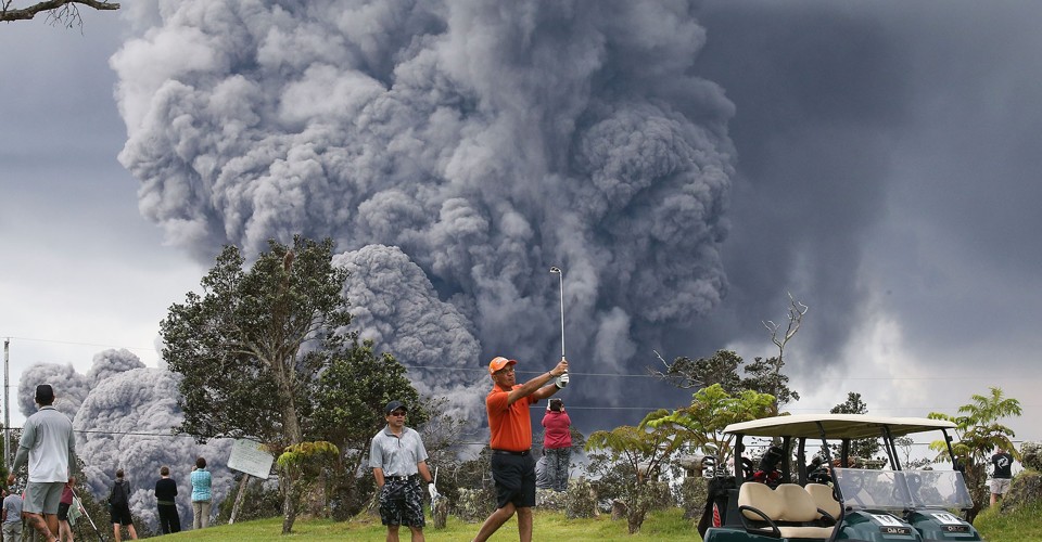 Read morePeople play golf as an ash plume rises in the distance from the Kilauea volcano on Hawaii's Big Island on May 15, 2018, in Hawaii Volcanoes National Park, Hawaii. The U.S. Geological Survey said a recent lowering of the lava lake at the volcano's Halemaumau crater had "raised the potential for explosive eruptions" at the volcano. #