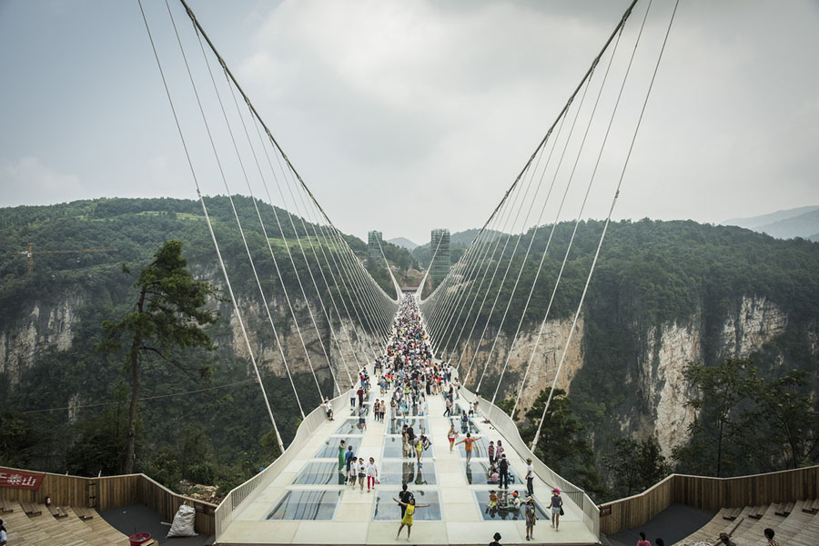 Read moreVisitors cross the Zhangjiajie Glass Bridge—when it opened, the world's highest and longest glass-bottomed bridge—suspended 853 feet (260 meters) above a valley in Zhangjiajie in China's Hunan Province on August 21, 2016. #