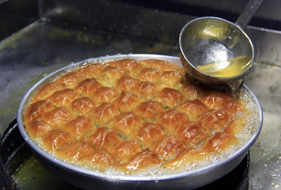 Read moreA baker pours a ladle of syrup on slices of baklavas at a Turkish bakery in Gaziantep, Turkey, on on May 21, 2018. Sweet pastry is a popular treat at iftar during the Islamic month of Ramadan. #