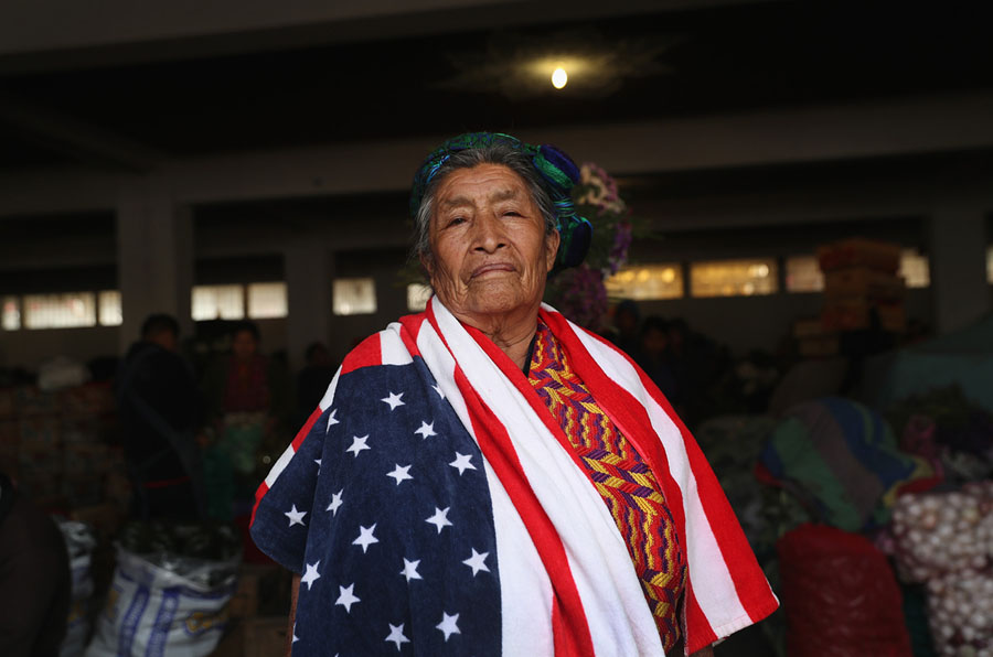 Read moreMaria Isabel Luna, 75, wears an American flag-themed towel for warmth over her traditional Mayan dress while working at a vegetable market on February 11, 2017, in Almolonga, Guatemala. She said that two of her family members work as immigrant laborers in Los Angeles. The Mayan town in the western highlands district of Quetzaltenango has surged in prosperity in recent years with high-productivity vegetable farming, exporting much of its excess crops to neighboring El Salvador. The town has been called the "Vegetable Basket of the Americas." Many locals attribute the town's change in fortune to the rapid growth of the evangelical Christian faith in the area, while others credit the increased use of pesticide farming. Regardless, the strong local economy will be key to maintaining the town's prosperity if the Trump administration follows through on curtailing remittance money sent back from undocumented immigrants in the U.S. to their families in Guatemala. #
