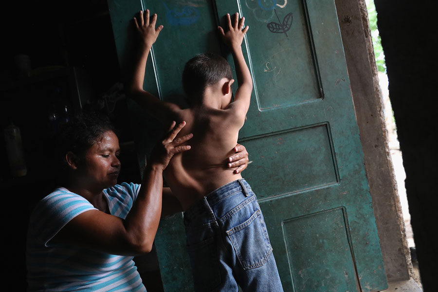 Read moreSonia Morales massages the back of her son Jose Issac Morales, 11, at the door of their one-room home on August 20, 2017, in San Pedro Sula, Honduras. The mother of three said that her son's spinal deformation began at age four, but she has never been able to afford the $6,000 surgery to correct his spinal condition. The boy's father, Issac Morales, 30, said he tried to emigrate to the U.S. in 2016 to work and send money home, but was picked up by U.S. Border Patrol officers in the Arizona desert and deported back to Honduras. #