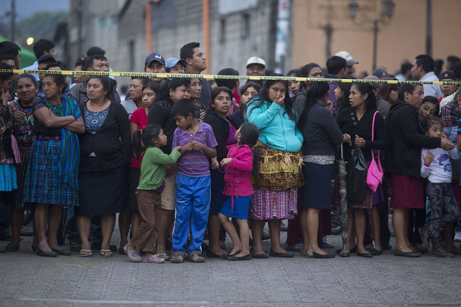 Read moreNeighbors stand outside a temporary morgue near Fuego volcano on June 3, 2018. #
