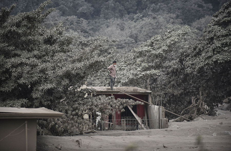 Read moreA man stands on the roof of a house in the ash-covered village of San Miguel Los Lotes on June 4, 2018, after the eruption of the Fuego volcano. #