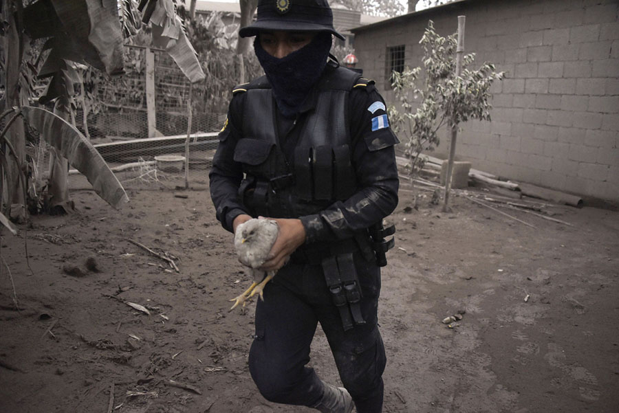 Read moreA police officer carries a chicken in the ash-covered village of San Miguel Los Lotes on June 4, 2018. #