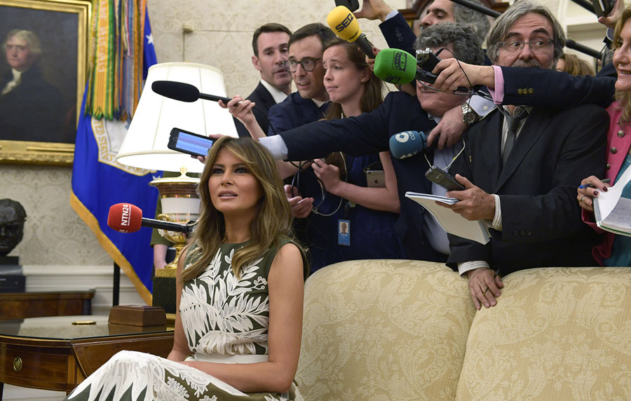Read moreFirst Lady Melania Trump sits on a couch surrounded by reporters as she participates in a meeting with President Donald Trump, Spain's King Felipe VI, and Queen Letizia in the Oval Office of the White House in Washington, D.C., on June 19, 2018. #
