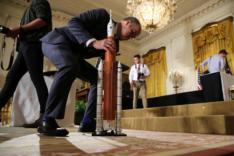Read moreAn aide assembles a model of NASA's Space Launch System rocket as the stage is set for President Trump to deliver remarks at a meeting of the National Space Council at the White House on June 18, 2018. #