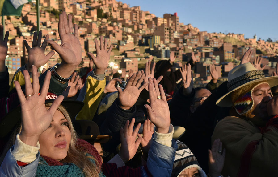 Read morePeople raise their hands during a ritual at sunrise to celebrate the Aymara New Year on June 21, 2018, at the Jacha Qullu viewpoint on the outskirts of La Paz. A crowd gathered to receive the first rays of Tata Inti (the sun god) during the celebration of the winter solstice, which marks the beginning of the 5526 year in the Aymara calendar. #