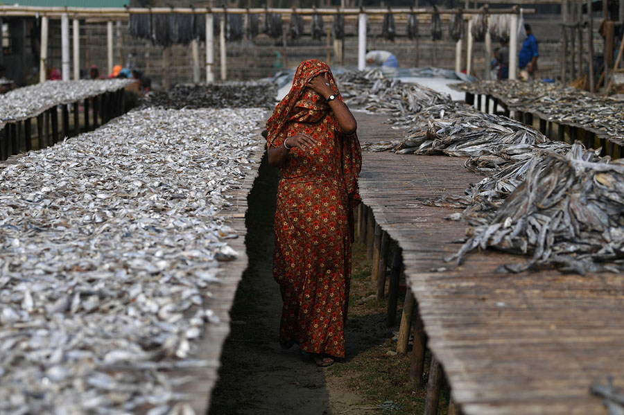 Read moreA Rohingya refugee woman walks through Nazirartek fish-drying yard, where she works, on March 23, 2018. The woman, who did not wish to be identified, escaped from Kutupalong refugee camp. #