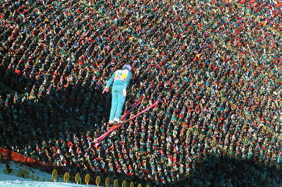 Read moreEddie "The Eagle" Edwards soars over the crowd as he makes his second jump of the day during a 90-meter ski-jump competition. Edwards, Britain's lone ski jumper, finished last. #