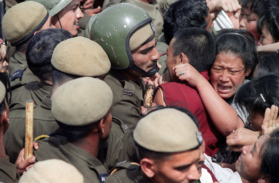 Read moreExiled Tibetan men and women weep before Indian helmeted riot policemen during a demonstration in New Delhi against the reported killings by Chinese security forces of Tibetan independence activists a few days before in Lhasa, on March 7, 1988. #
