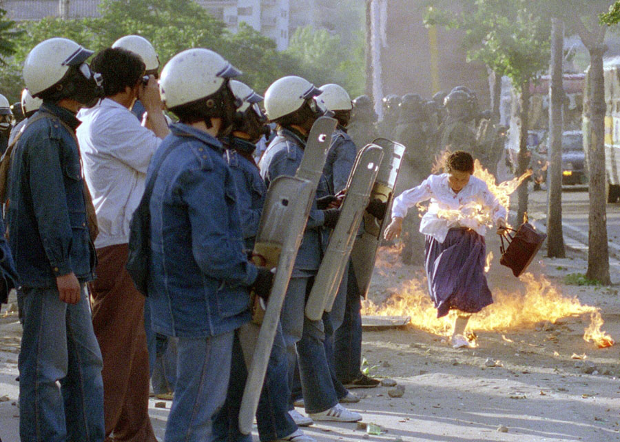 Read moreA Korean woman is engulfed in firebomb flames thrown by dissident students during an anti-government demonstration as she passes on the street in front of Dankook University in Seoul, on May 25, 1988. #