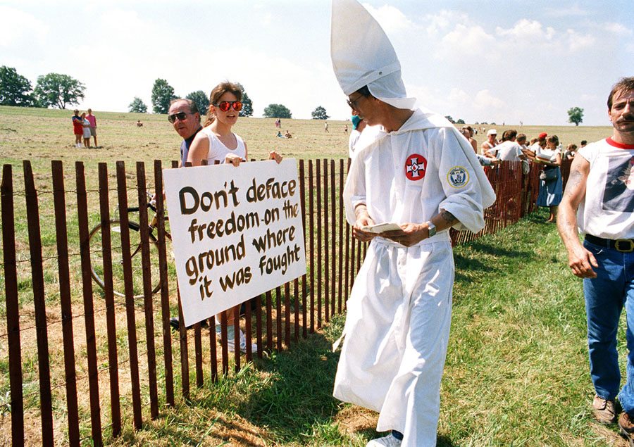 Read moreA Ku Klux Klan member reads a sign posted by Mia Bosna, left, as he passes out literature at a KKK rally at Valley Forge National Park in Valley Forge, Pennsylvania, on August 8, 1988. #