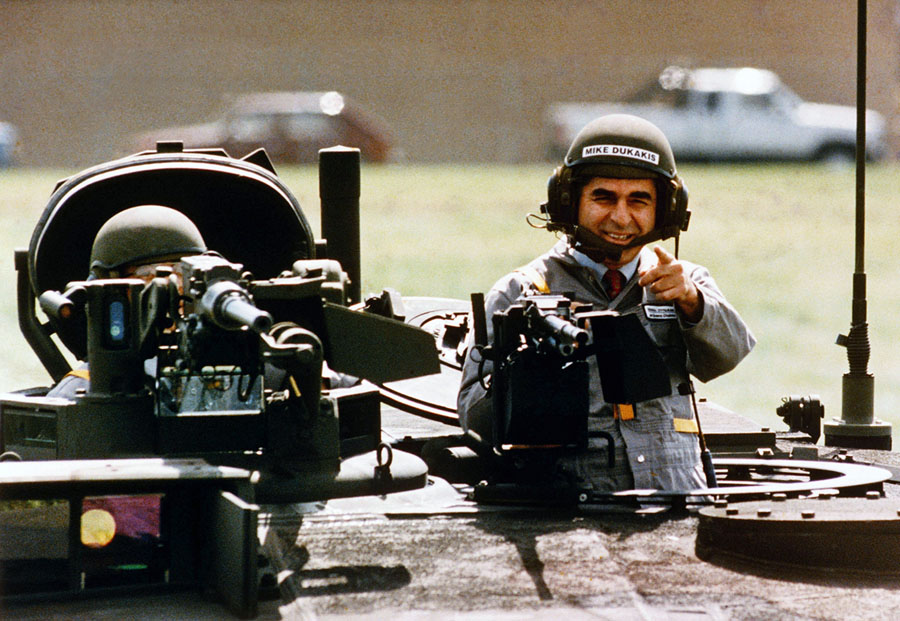 Read moreIn this September 13, 1988 photo, the Democratic presidential candidate Michael Dukakis gets a free ride in a new M1A1 battle tank during a visit to General Dynamics in Sterling Heights, Michigan, where he told workers he's not soft on defense. #