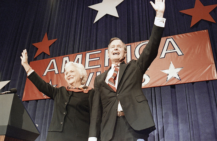 Read morePresident-elect George H.W. Bush and his wife Barbara wave to the crowd at a victory rally after winning the 1988 U.S. presidential election on November 8, 1988, in Houston, Texas. #