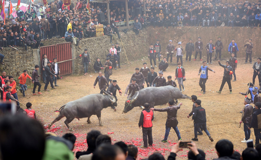 Read moreVillagers watch bulls fight against each other during a competition in Congjiang County on February 24, 2018. 36 bulls from surrounding villages competed event held on the ninth day of the Lunar New Year. #