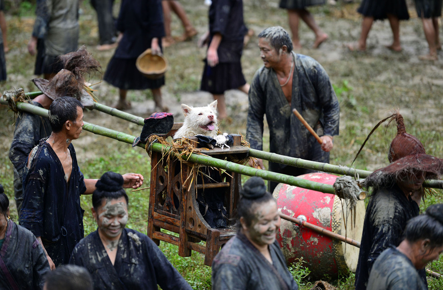 Read moreMiao people carry a dog in a folk festival parade in Jiaobang Village of Jianhe County on September 2, 2017 in Qiandongnan Prefecture. Miao people dress dogs with human clothes and carry them in wooden chairs during a festival to show gratitude to dogs for helping Miao ancestors to find water, learn to be grateful and to advocate the equality among all things. #