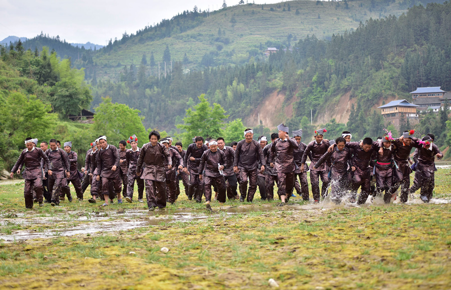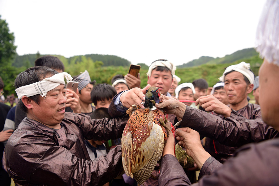Read moreMiao people wearing festive costumes celebrate traditional "Gayaguo" Festival in Datang Village on April 27, 2018, in Qiandongnan Prefecture. Miao people play Lusheng, scramble for pheasants and wrap themselves with mud to celebrate Gayaguo - after which they will be busy with spring plowing. #