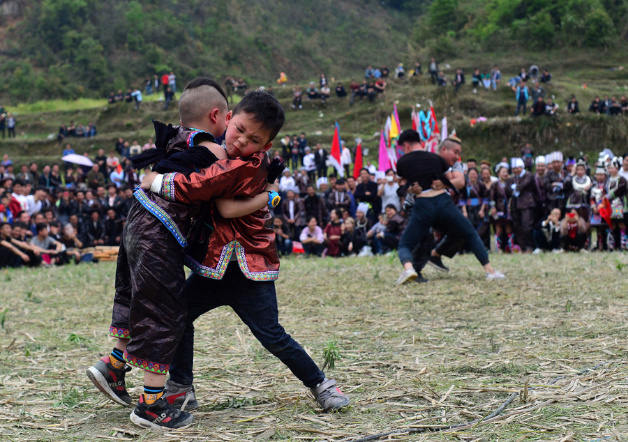 Read moreDong children compete in a wrestling competition at Kengdong Village on March 31, 2018 in Qiandongnan Prefecture. Villagers from 13 ethnic minority groups attended the annual wrestling competition to welcome spring harvest. #