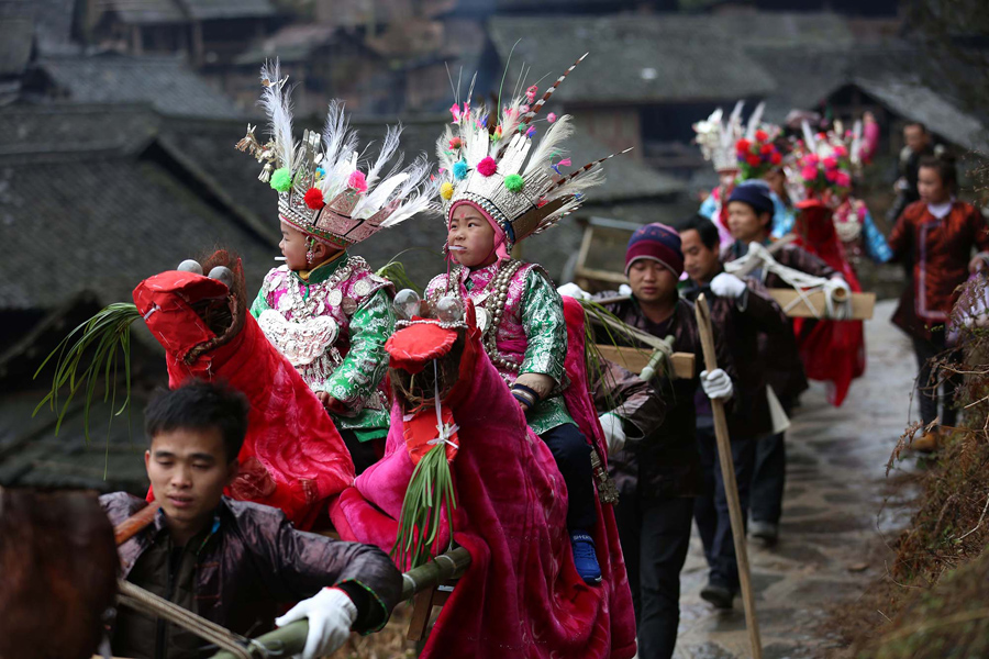 Read moreDong children take part in a Taiguanren Festival ('Carrying the Governors Parade' in Chinese) to wish for favorable weather in the new year in Liping County on February 22, 2018 in Qiandongnan Prefecture. "Taiguanren" is a folk custom of Dong people in which children or guests dressed up are carried by people to patrol around the village. #