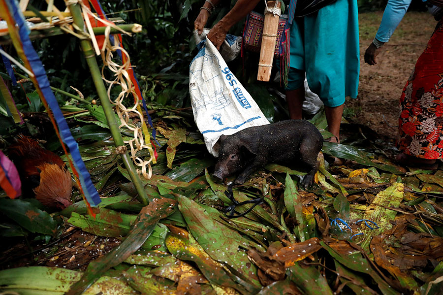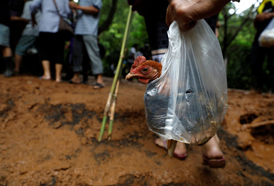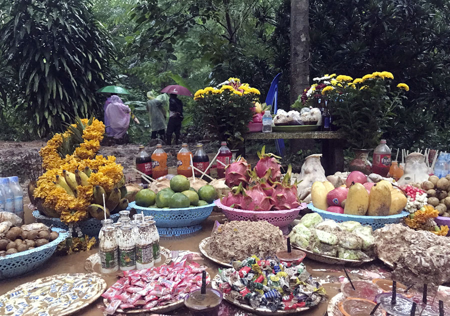 Read moreFamily members and relatives pray at the entrance of Tham Luang cave in Khun Nam Nang Non Forest Park on June 26, 2018. Some hold fishing nets to symbolically fish out lost spirits inside the cave, as others perform a ritual calling to the missing. #