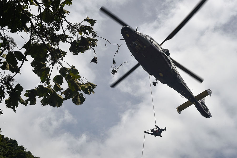 Read moreA Thai Air Force member drops from a helicopter into a clearing in the forest near a possible overground opening to the Tham Luang cave, on June 30, 2018, as the rescue operation continues. #