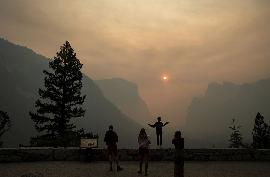 Read moreHannah Whyatt poses for a friend's photo as smoke from the Ferguson Fire fills Yosemite Valley on July 25, 2018, in Yosemite National Park. Campsites and lodges emptied out after disappointed tourists were ordered to leave the heart of Yosemite National Park by noon Wednesday, as firefighters battled to contain a huge wildfire just to the west that has threatened the park's forest and sent up smoke that obscured grand vistas of waterfalls and sheer granite faces. #