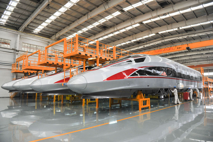 Read moreWorking staff assemble China's "Fuxing" high-speed bullet trains on the manufacturing line of CRRC Qingdao Sifang Co., Ltd. in Qingdao, Shandong Province, on June 8, 2018. #