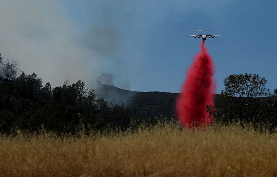 Read moreA firefighting air tanker drops Foscheck fire retardant on a hillside ahead of the County Fire on July 2, 2018, in Guinda, California. The fast-moving County Fire that started on Saturday afternoon has scorched nearly 45,000 acres as it continues to burn through dry grass and brush. #