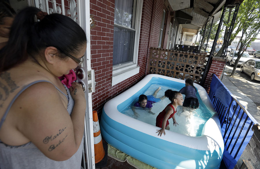 Read moreLuz Pratts, left, watches her daughters Karina, 11, Amarilys, 9, background, play with Laylana, 3, in an inflatable pool on the front porch as they keep cool in the West Kensington neighborhood of Philadelphia, on July 2, 2018. #