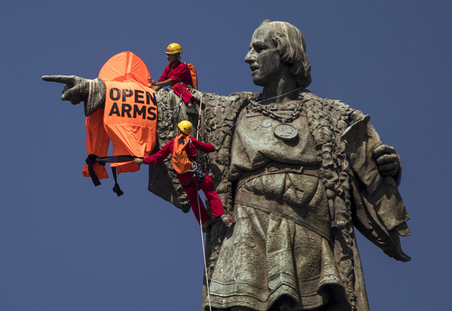 Read moreTwo activists climb on top of the 60-meter (197-foot) Christopher Columbus tower after placing a vest with the words "Open Arms" on the statue in Barcelona, Spain, on June 4, 2018. The activists were attempting to turn attention to the loss of life of migrants and refugees in the Mediterranean Sea. #