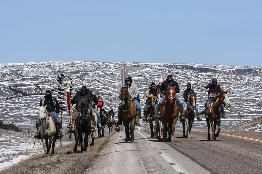Read moreA group of the Fort Laramie treaty riders head out in the morning along the local highway on the Cheyenne River Reservation outside of Bridger, South Dakota, on April 16, 2018. #