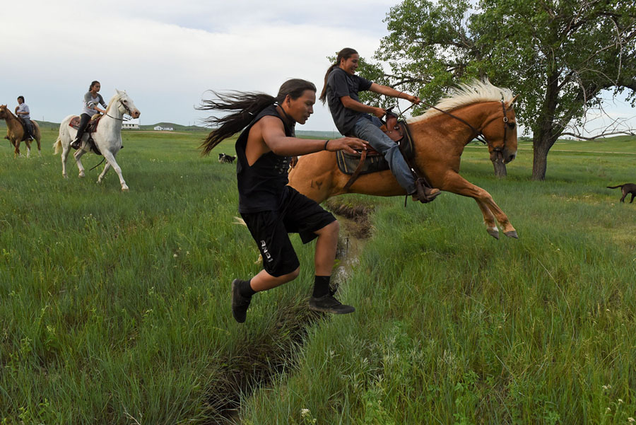 Read moreMaske Ahwe Chu Kinya Plenty Chief, 14, from Eagle Butte on the Cheyenne River Indian Reservation (top) wrestles with some of the Fort Laramie treaty riders as they play games together in their communal camp in Harrison, Nebraska, on April 24, 2018. #