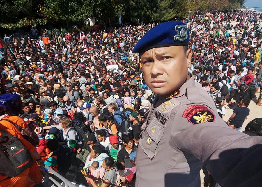 Read moreThe chief of the water police of Lombok, Dewa Wijaya, takes a picture in front of hundreds of people attempting to leave the Gili Islands after the earthquake on August 6, 2018, in this handout picture obtained by Reuters from social media. #