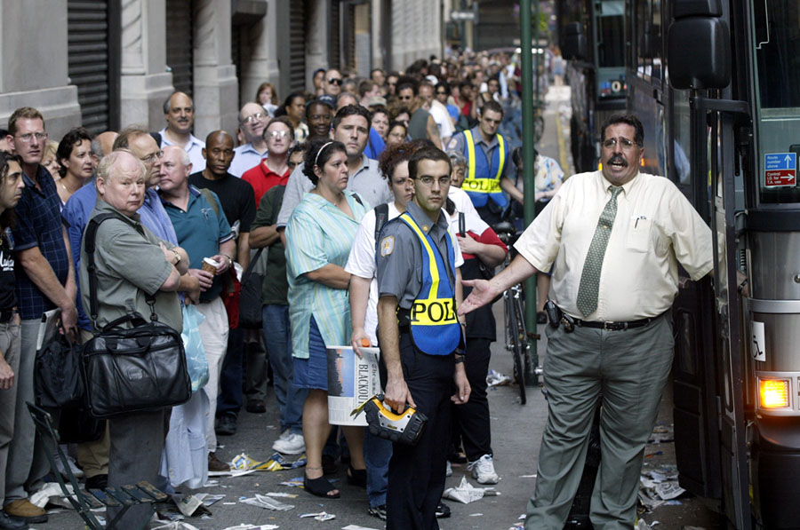 Read moreSeveral hundred people wait for buses in New York on August 15, 2003. Most train service was knocked out after the power outage, and the commuters shown here, many of whom spent the night in the city, were boarding buses that would take them to a connection with a diesel-powered train outside the city. #