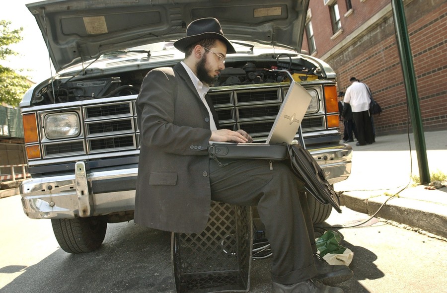 Read moreImprovising in the blackout, the college student Shmuel Aziza powers his laptop computer off of a car battery beside Chabad Lubavitch World Headquarters, on August 15, 2003, in the Crown Heights neighborhood of Brooklyn. #