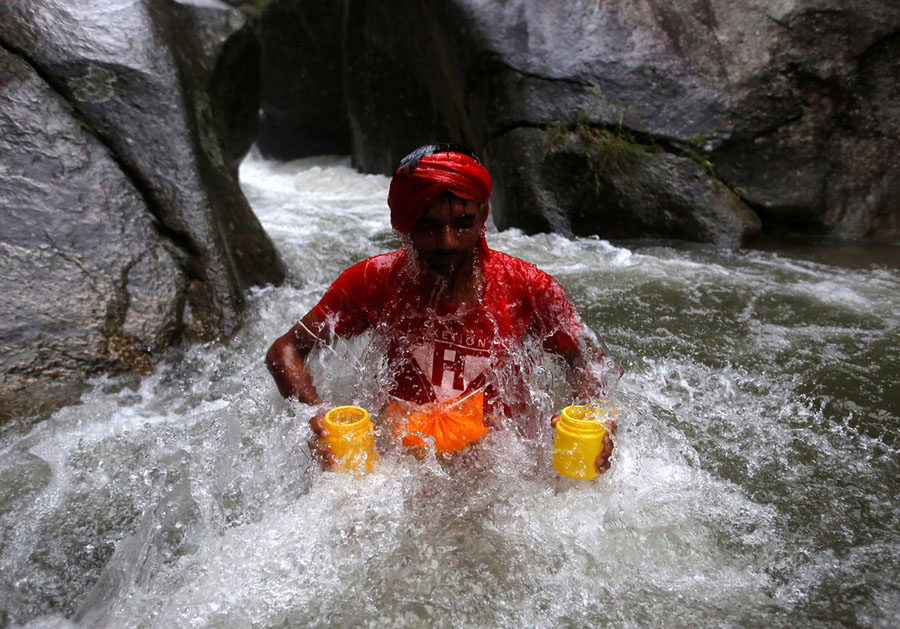 Read moreA devotee emerges holding plastic bottles filled with water, considered to be holy, from the Bagmati River during the "Bol Bom" (Say Shiva) pilgrimage in Kathmandu, Nepal, on July 30, 2018. Faithful, chanting the name of Lord Shiva, trek about 15 km towards Pashupatinath temple seeking good health, wealth and happiness. #