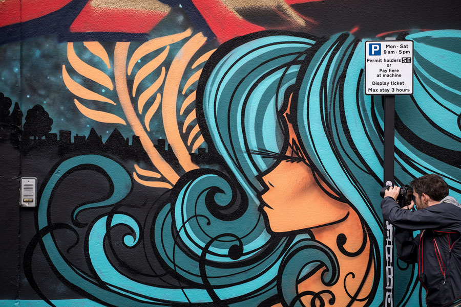 Read moreA man takes a photograph of a new piece of street art by the artist Inkie on the final day of UpFest, The Urban Paint Festival, 2018, on July 30, 2018, in Bristol, England. #