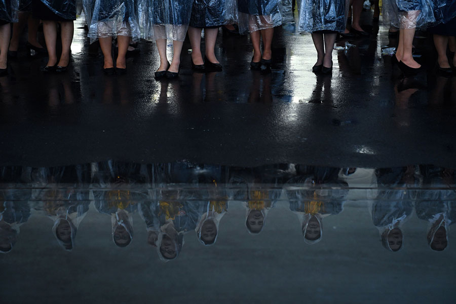 Read moreThai government officials stand in the rain during celebrations for Thailand's King Maha Vajiralongkorn's 66th birthday near the Grand Palace in Bangkok on July 28, 2018. #