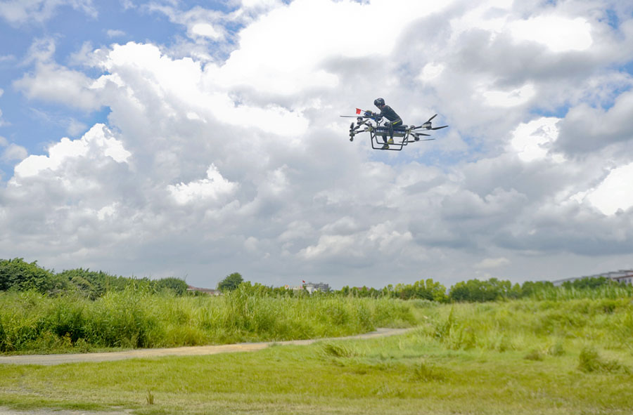 Read moreA man named Zhao Deli from Dongguan manipulates a self-developed "flying motorcycle" above grassland on July 23, 2018, in Dongguan, Guangdong province, China. After over a thousand test flights, the flying motorcycle is able to fly at heights of seven to eight meters. #
